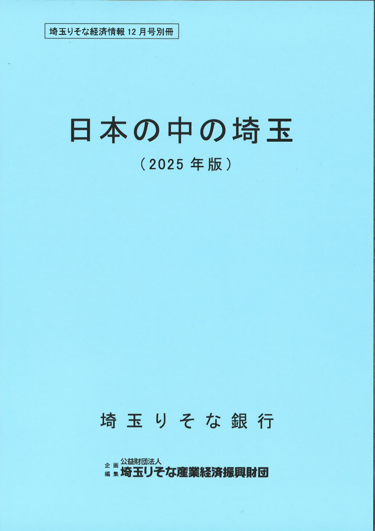 「日本の中の埼玉」は、毎年12月に「埼玉りそな経済情報」の別冊として発刊している県内の統計集です。公的機関より公表されている統計を分野ごと、時系列にご覧いただけます。「埼玉りそな経済情報」に並んで、年間を通してご愛読いただいている一冊です。