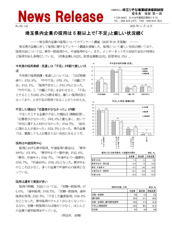 埼玉県内企業に対して採用に関するアンケート調査を実施した。採用について厳しい状況が続いており、採用方法については、新卒一括採用から、中途採用中心へ、また、インターネットや人材紹介会社の利用など採用方法も多様化している。(対象企業1,032社、回答企業数323社、回答率31.3%)。
