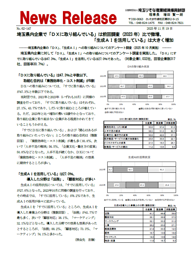 埼玉県内企業に対して「DX」、「生成AI」への取り組みについてのアンケート調査を実施した。「DX」にすでに取り組んでいるは47.3%、「生成AI」を活用しているは27.0%であった。(対象企業1,032社、回答企業数317社、回答率30.7%)。