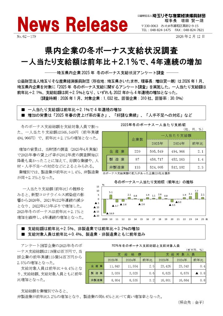 公益財団法人埼玉りそな産業経済振興財団(所在地:埼玉県さいたま市、理事長:増田賢一朗)は2026年1月、埼玉県内企業を対象に「2025年 冬のボーナス支給に関するアンケート調査」を実施した。一人当たり支給額は前年比+2.1%、支給総額は同+2.5%となり、いずれも2022年から4年連続の増加となった。