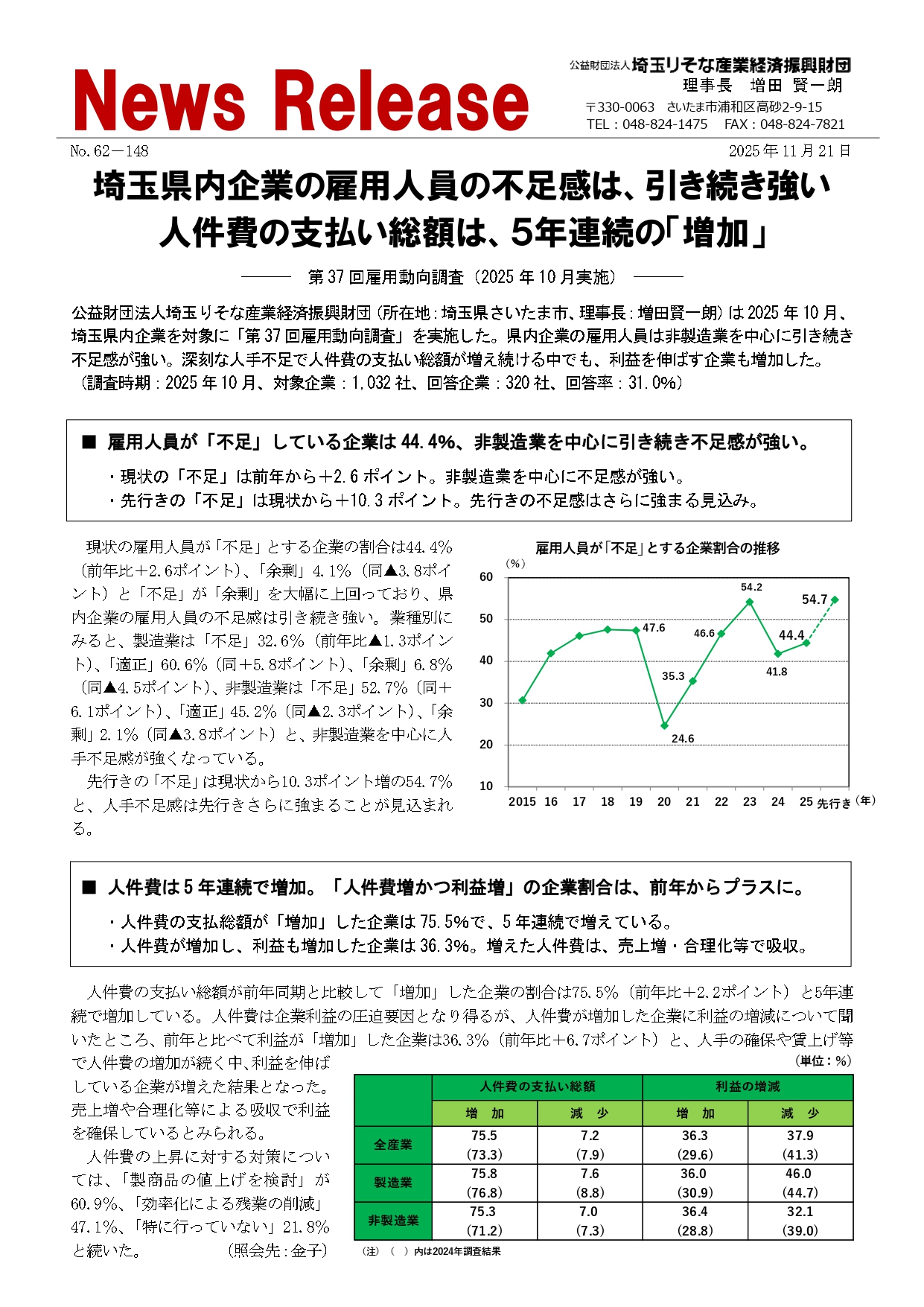 公益財団法人埼玉りそな産業経済振興財団(所在地:埼玉県さいたま市、理事長:増田賢一朗)は2025年10月、埼玉県内企業を対象に「第37回雇用動向調査」を実施した。県内企業の雇用人員は非製造業を中心に引き続き不足感が強い。深刻な人手不足で人件費の支払い総額が増え続ける中でも、利益を伸ばす企業も増加した。